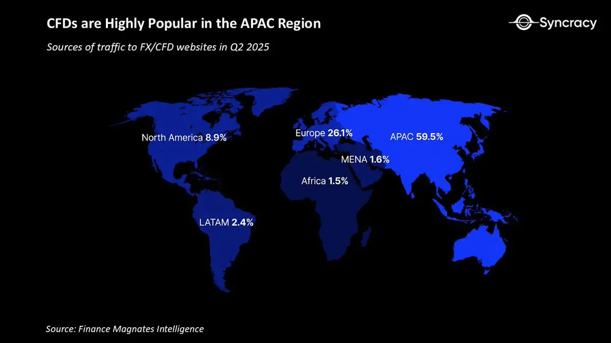 虽然期权交易在美国散户交易者中呈爆发式增长,但在亚洲,散户交易者越来越倾向于差价合约。2025年,全球外汇/差价合约行业的月均交易量超过30万亿美元,远高于十年前的不到10万亿美元。值得注意的是,约60%的CFD网站流量来自亚太地区,而北美仅占约9%。