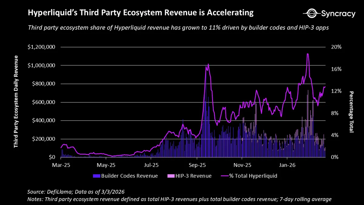 结合构建者代码,这些机制允许部署者启动完全建立在Hyperliquid之上的交易所。如今,Hyperliquid的第三方生态系统创造了9000万美元的年化收入。竞争对手现在被迫问自己一个关键问题:是与Hyperliquid竞争更好,还是干脆与他们合作?