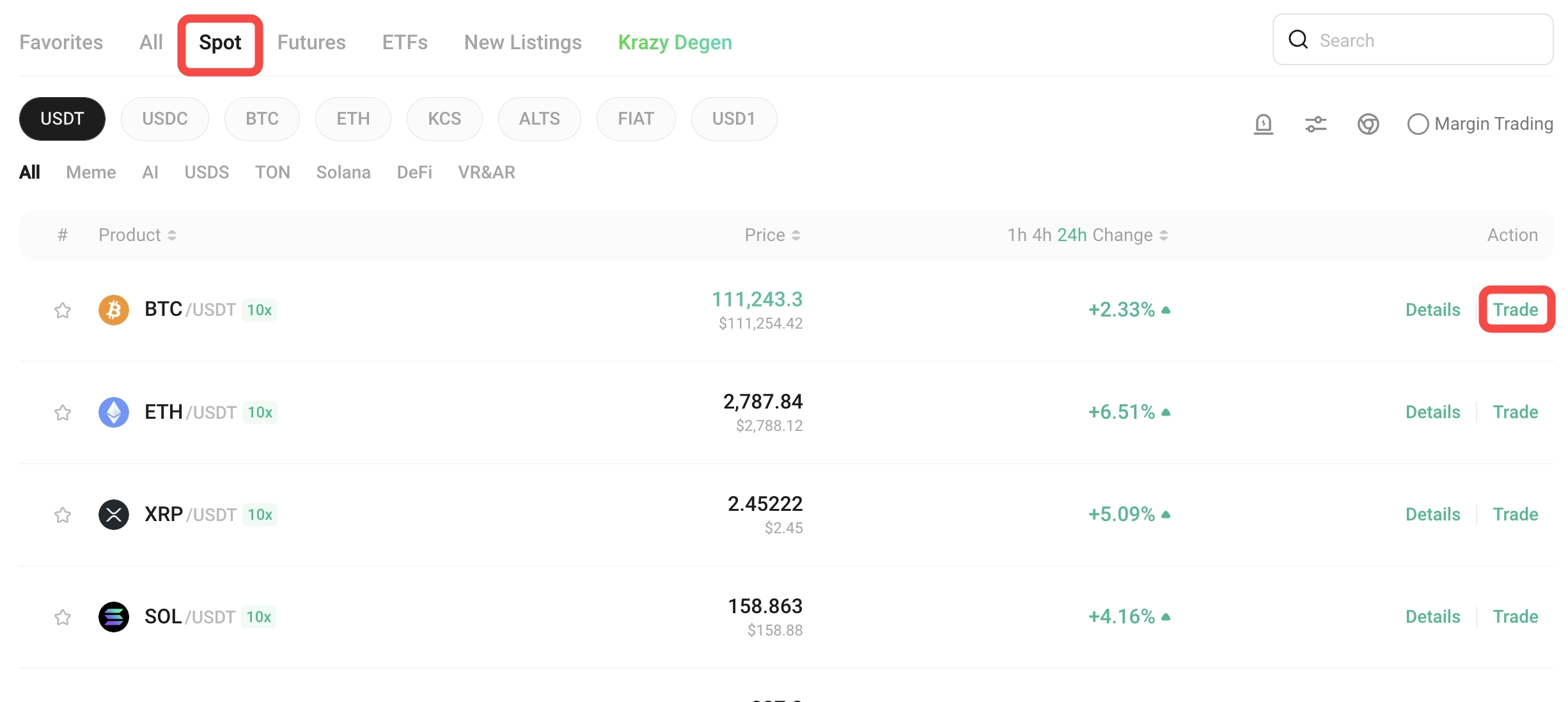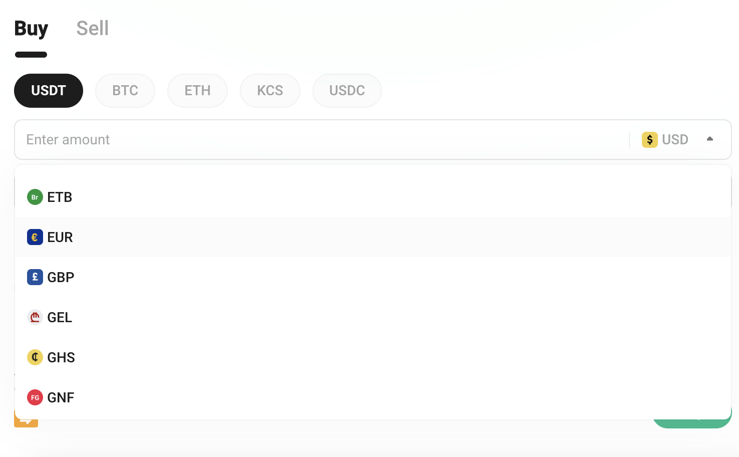 確保您的 KuCoin 帳戶中已持有另一種加密貨幣(例如 USDT,與美元掛鉤)。