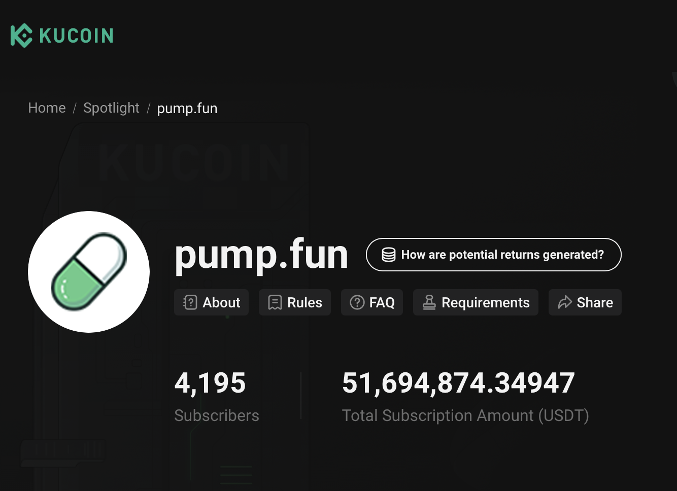 大量用戶參與:通過 KuCoin Spotlight,我們充滿活力的社區總共認購了驚人的16,499,580.70 USDT的 $PUMP 代幣。這種壓倒性的需求展現了我們用戶對 pump.fun 潛力的興奮和信心。