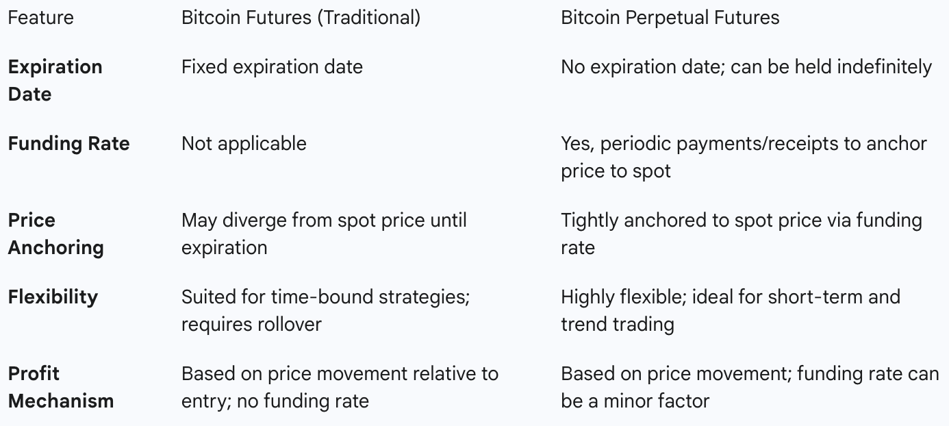 沒有到期日。這使得交易者能夠無期限持倉,只要他們能滿足保證金要求。為了使永續合約的價格與比特幣的即期(現時市場)價格保持密切一致,採用了名為