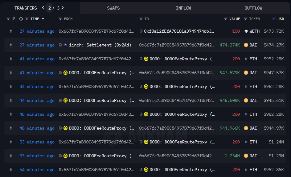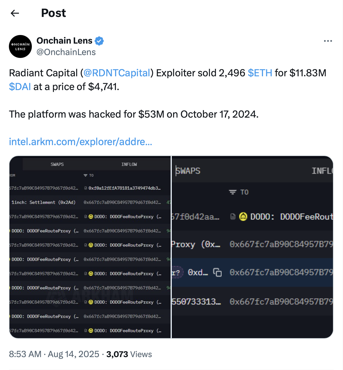 光輝資本遭駭:攻擊者於2025年8月14日出售2496 ETH,換取1180萬美元的DAI