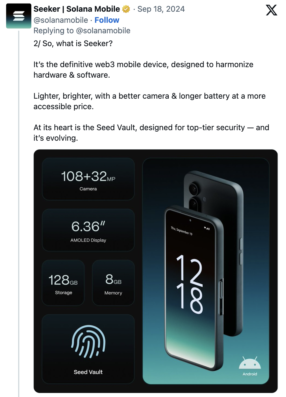 將其定位為突破性的Web3移動設備,Seeker的售價幾乎是其前身的一半,旨在吸引更廣泛的受眾,同時提供超越memecoin社區的增強功能。