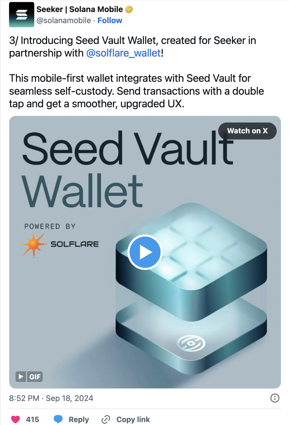 種子庫錢包:Seeker 將推出一個以移動設備為優先的加密錢包,專為 Web3 用戶設計。與設備原生集成的自我托管種子庫確保交易安全且流暢。雙擊確認和簡化的賬戶管理只是 Solana 與 Solflare 合作增強 Web3 體驗的幾個功能之一。