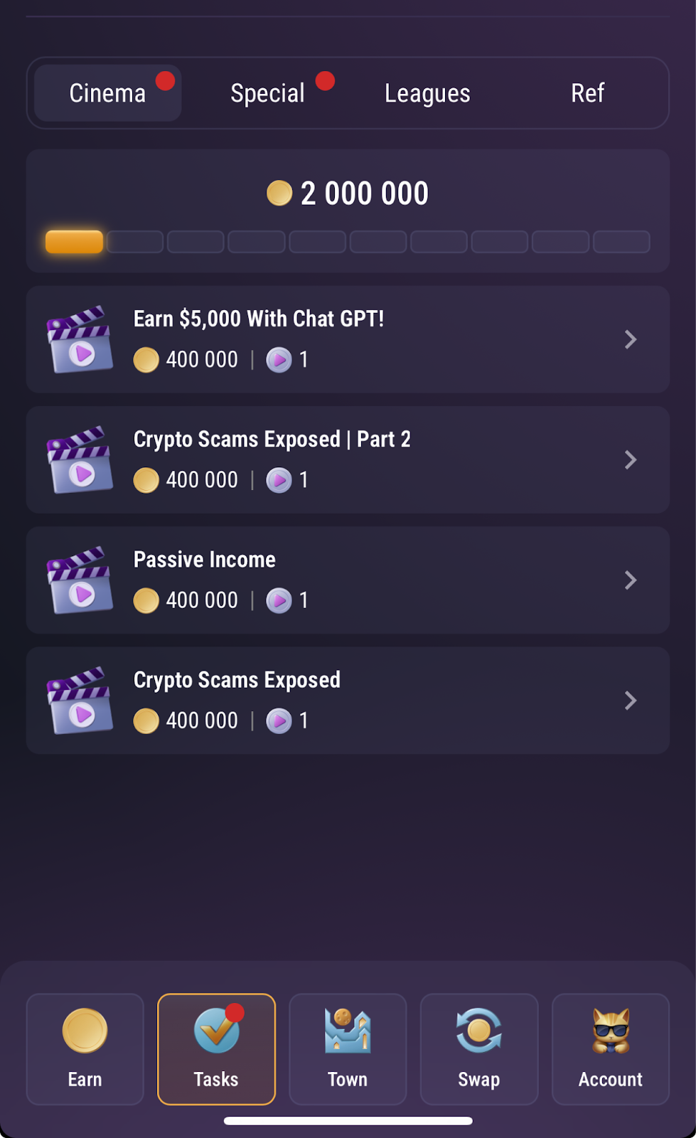 完成特殊任務:通過加入 Telegram 頻道、在社交媒體上關注 TapSwap 或觀看特定視頻來賺取額外硬幣。