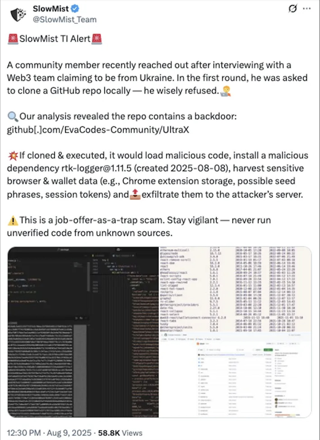 2025 年 8 月 9 日得到確認,當時一位社群成員參與了一場他們認為是普通 Web3 工作面試的過程,並被指示克隆 GitHub 儲存庫