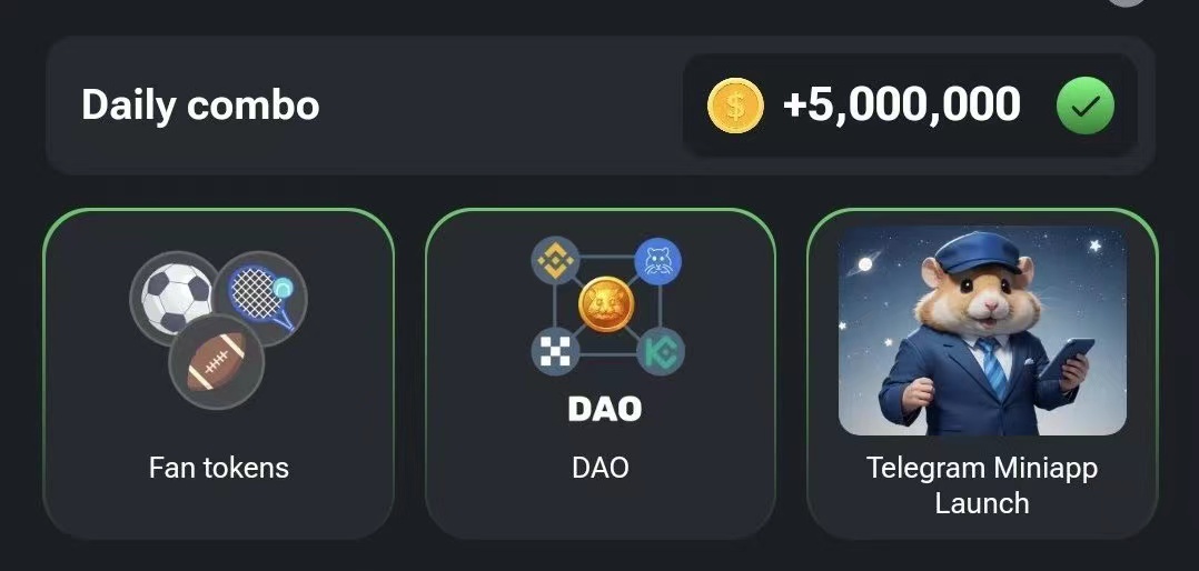 Daily Combo 是流行的Hamster Kombat 點擊遊戲中的一個任務,允許玩家每天解鎖 500 萬硬幣。要解決 Hamster Kombat Daily Combo,您需要從 PR & Team、Markets、Legal、Web3 和 Specials 等類別中選擇正確的三張卡片組合。一旦您領取了 Daily Combo 的獎勵,您可以使用它們來加速點擊進程,每次點擊賺取更多硬幣。通過 Daily Combo 賺取 500 萬硬幣,您可以升級您的加密貨幣交易所,並提升您在遊戲中的賺錢潛力。每天 GMT 12 點會釋放一組新的 Hamster Kombat Daily Combo 三張卡片。
