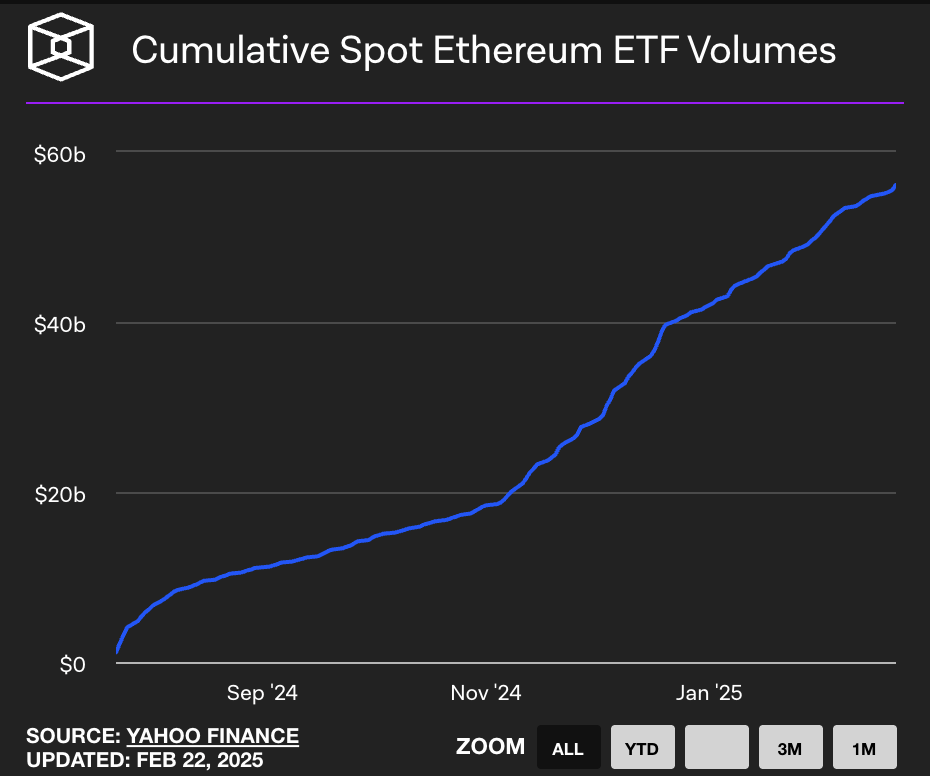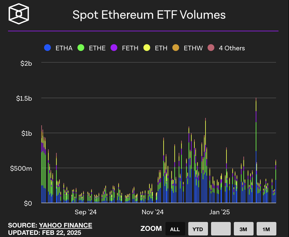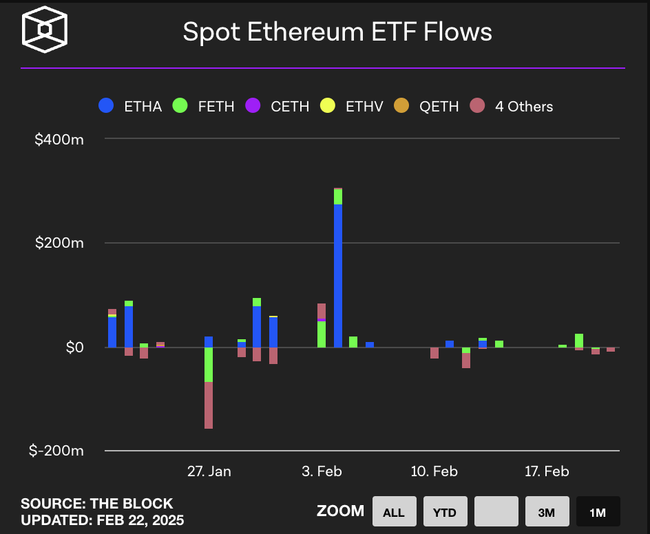 在 2025 年 2 月 18 日至 2 月 21 日的一週內,以太坊現貨 ETF 獲得了 161 萬美元的淨流入數據。顯示 Fidelity Ethereum ETF (FETH) 每週錄得淨流入 2,632 萬美元,其歷史淨流入總額現已達到 15.4 億美元。相比之下,Grayscale Ethereum Trust 每週淨流出 1,579 萬美元,其歷史淨流出達到 40 億美元。所有以太坊現貨 ETF 的總資產淨值現為 99.81 億美元,淨資產比率為 3.14%。累計流入達到 31.54 億美元,反映出市場的強勁需求。