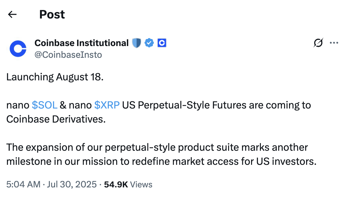 nano XRP和SOL永續期貨合約。此舉旨在為