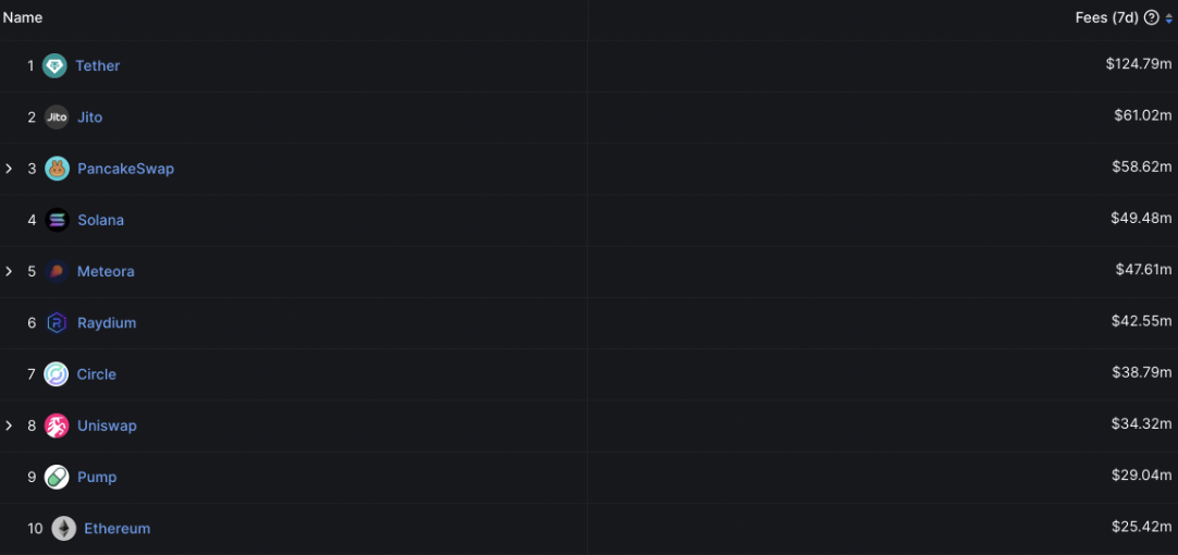 最近七天產生費用的頂級協議。來源:DeFiLlama。