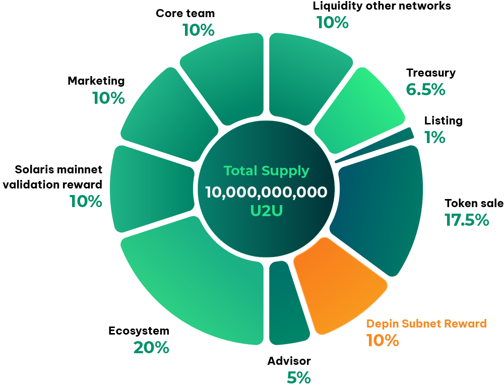 $U2U 代幣是 U2U 網絡的原生幣,總供應量為 100 億代幣。供應量的一大部分被分配用於支持網絡的 DePIN 計劃,特別是獎勵子網節點擁有者和運營商。