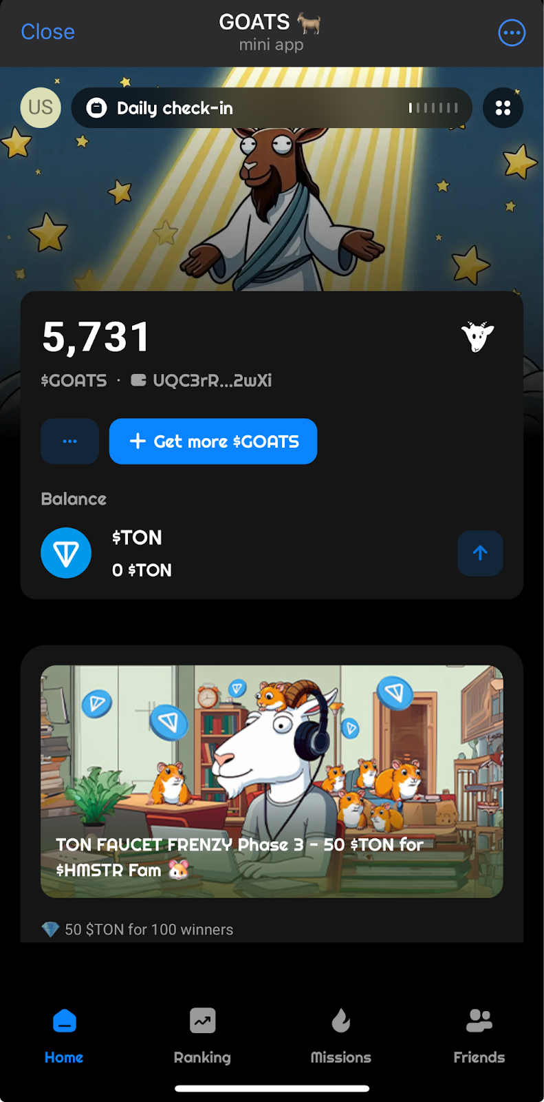自推出以來,GOATS 迅速獲得動力,並在 Telegram 中建立了強大的社區。該平台現在擁有超過 300 萬每日活躍用戶(DAUs),成為最活躍的 Telegram 迷你應用程序之一。此外,GOATS 已經達到 1700 萬月活躍用戶(MAUs),每月有數百萬用戶與該平台互動。其一個突出的特點是分發 $TON 獎勵,通過每日活動和迷你遊戲提供真正的賺錢機會。GOATS 的迅速崛起在 Telegram 遊戲社區中引起了極大關注,為其用戶結合了娛樂和財務機會。其龐大的用戶基數和多樣化的遊戲範圍,使 GOATS 成為 memecoin 領域的重要玩家。