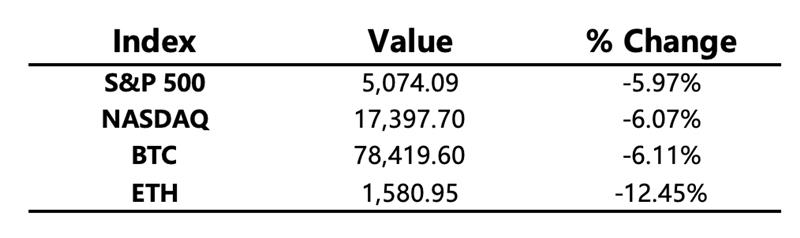- 市場環境:美國強勁非農就業數據與全球貿易戰升級形成對比。鮑威爾表示無意干預市場,引發經濟衰退擔憂並導致股市連續兩日暴跌——為二戰以來第四大跌幅,也是自疫情以來最糟糕的周跌幅。週末期間,特朗普團隊對貿易戰採取強硬立場,導致周一全球市場蒙上陰影。隨後出現「黑色星期一」:美國股指期貨開盤暴跌,日本股市觸發熔斷機制,而此前表現堅挺的比特幣跌破$81,200支撐位,收跌6.11%。ETH跌破$1,600,引發連環清算。ETH/BTC比率跌破0.02,觸及五年新低,而比特幣主導率突破63%,山寨幣普遍下跌。