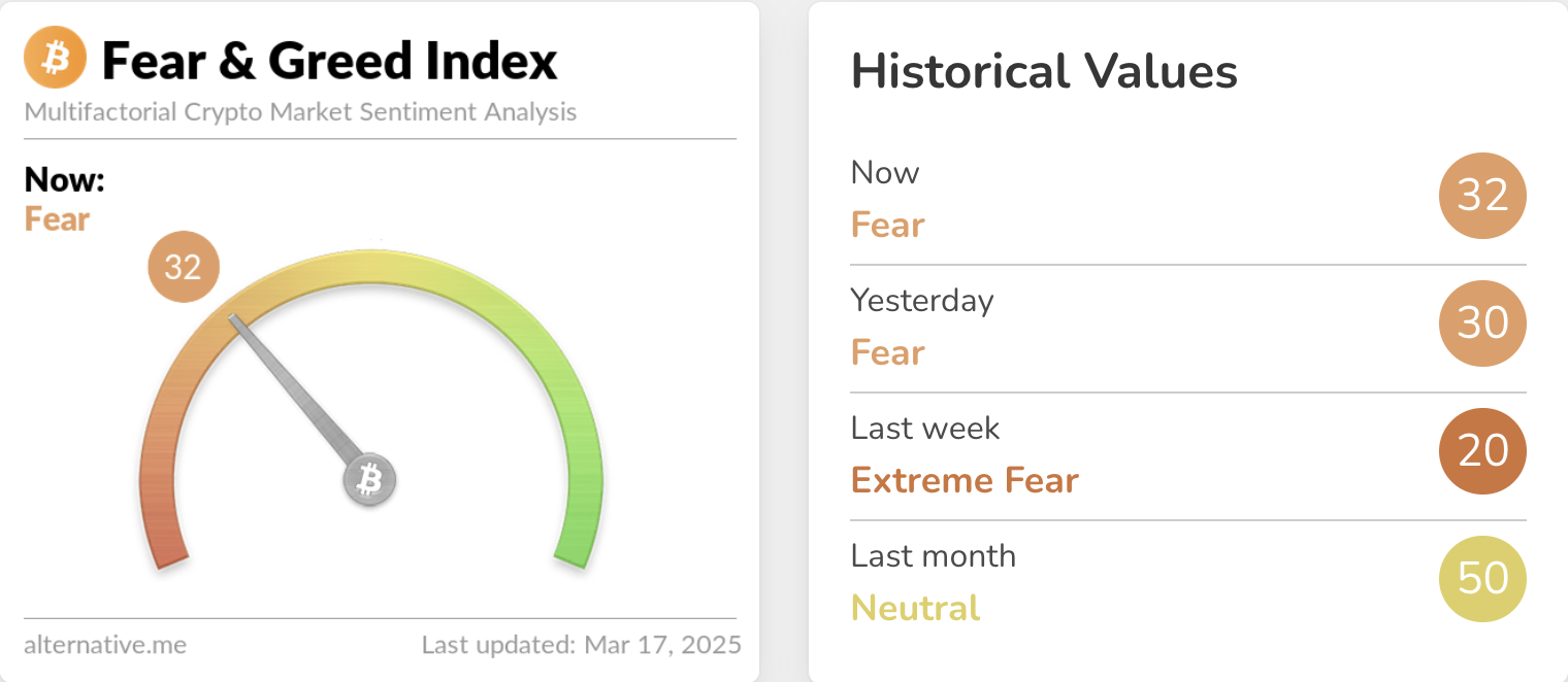 恐懼與貪婪指數已增至32,仍表明市場情緒偏向恐懼。比特幣仍未突破100,000美元大關,並且出現有限的巨鯨持倉以及低波幅的情況。