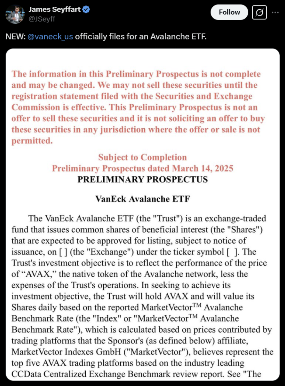 VanEck 向美國證券交易委員會(SEC)申請批准推出 AVAX 交易所交易基金(ETF)。該公司於 2025 年 3 月 14 日在特拉華州提交了 VanEck Avalanche ETF 的申請。註冊文件指出:「信託的投資目標是反映 Avalanche 網絡原生代幣 'AVAX' 的價格表現,減去信託運營的相關費用。」這被認為是首個 AVAX ETF。此外,Bloomberg Intelligence 分析師 James Seyffart 在 X 平台上表示,「值得注意的是——信託註冊早些時候已經被廣泛分享,但這是首次正式向 SEC 提交申請。」其他公司也正在尋求 SEC 批准追蹤 SOL、XRP、DOGE 和 LTC 的加密貨幣 ETF。此外,SEC 於 2024 年 1 月批準了現貨比特幣 ETF,並於 7 月批準了現貨以太坊 ETF。近期,該機構還逆轉了有爭議的加密貨幣會計指導意見,終止執法行動,成立加密貨幣工作小組並發布了一份 memecoin 聲明。
