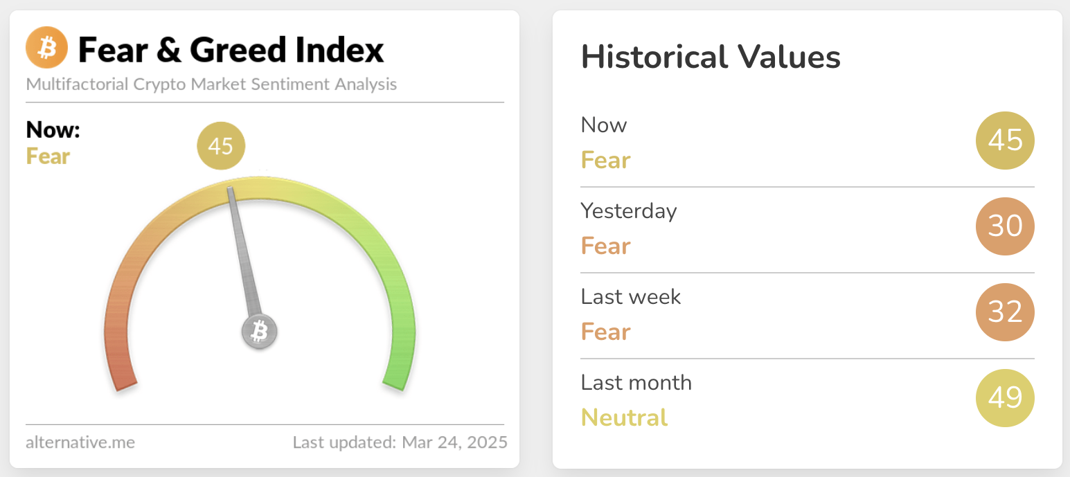 加密恐懼與貪婪指數已從昨日的30升至45,但整體市場情緒仍然傾向於恐懼。這種混合情緒反映了投資者在審慎樂觀的態度下,平衡了監管進展和行業創新與更廣泛的宏觀經濟不確定性。