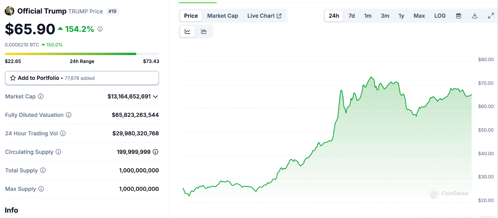 官方$TRUMP模因幣在48小時內增長超過500億美元