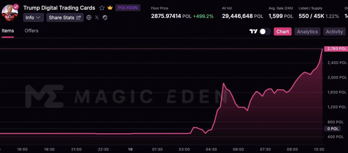 來源:Magic Eden。川普NFT交易量。川普NFT卡片在Memecoin推出後暴漲400% 3