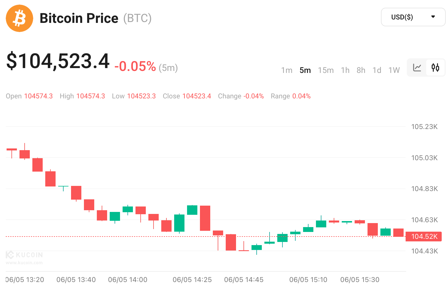 2025 年 6 月 4 日,加密貨幣市場表現參差不齊,Bitcoin (BTC) 維持在 $104,000 以上的水平。 BTC 的交易價格約為 $104,565,過去 24 小時內微跌 0.76%。 Ethereum (ETH) 價格徘徊在 $2,611 附近,下跌 0.65%,而 Solana (SOL) 下跌 1.75% 至 $153.46。 相對而言,XRP 表現出韌性,交易價格為 $2.19,僅小幅下跌 1.79%。