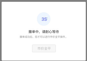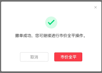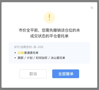 新流程:用户点击“市价全平”后,若该仓位存在未成交的平仓单,系统会弹出提示:您需“全部撤单”成功后,再进行市价全平操作。如下图所示