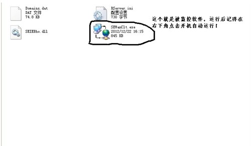 到这里基本就算是大功告成了,把整个文件传到你想被监控的电脑里点击运行,被监控软件。(注:这个软件运行后在桌面右下角显示,改选开机启动运行!)