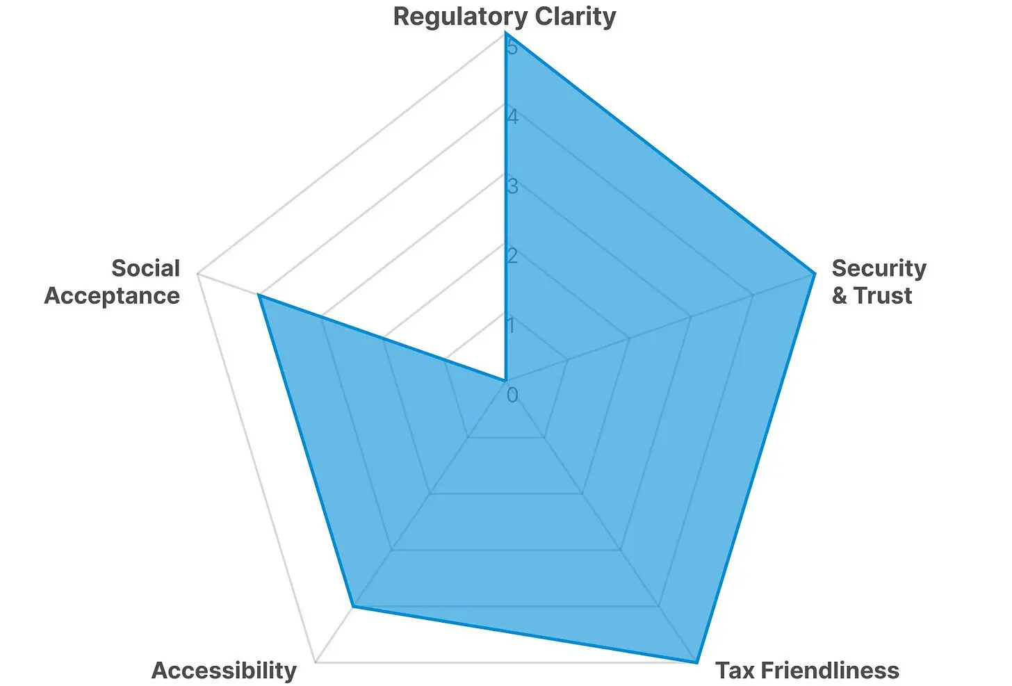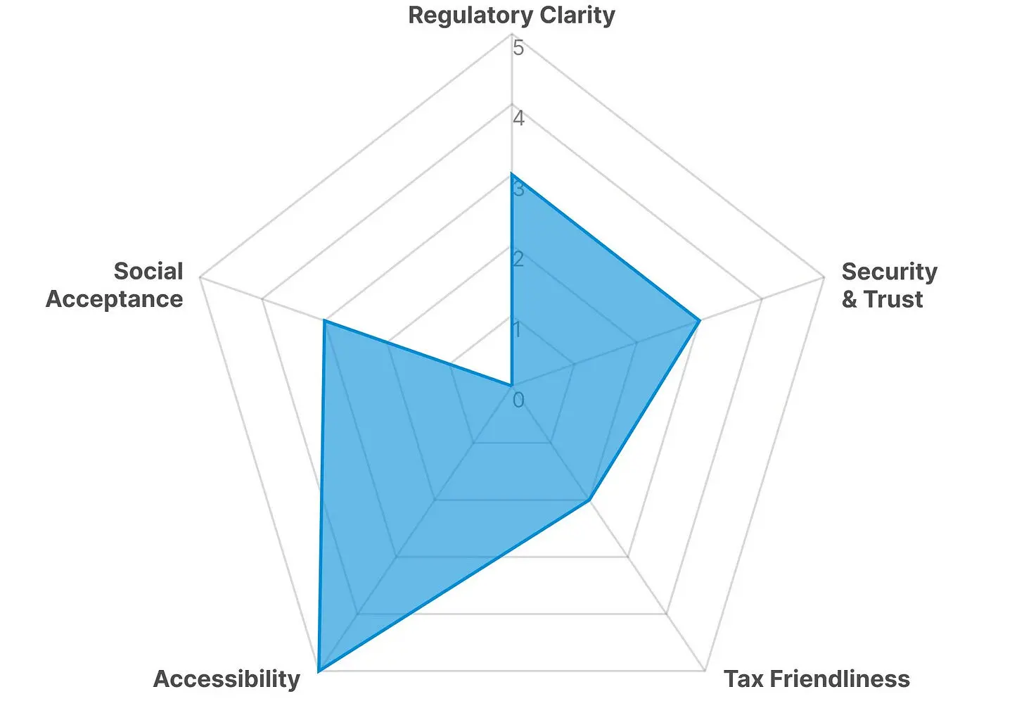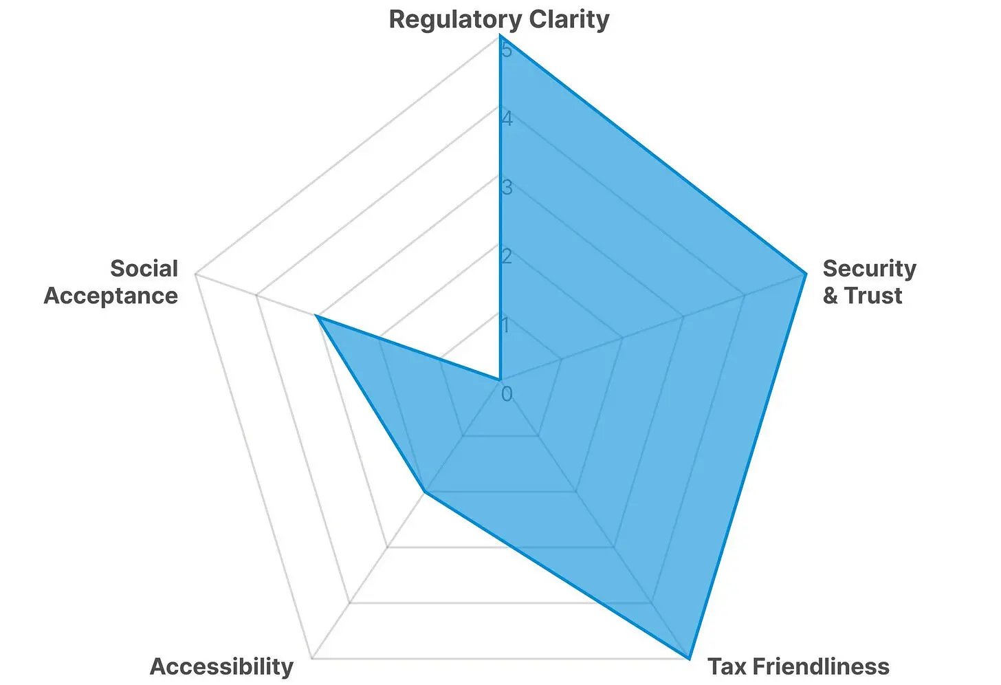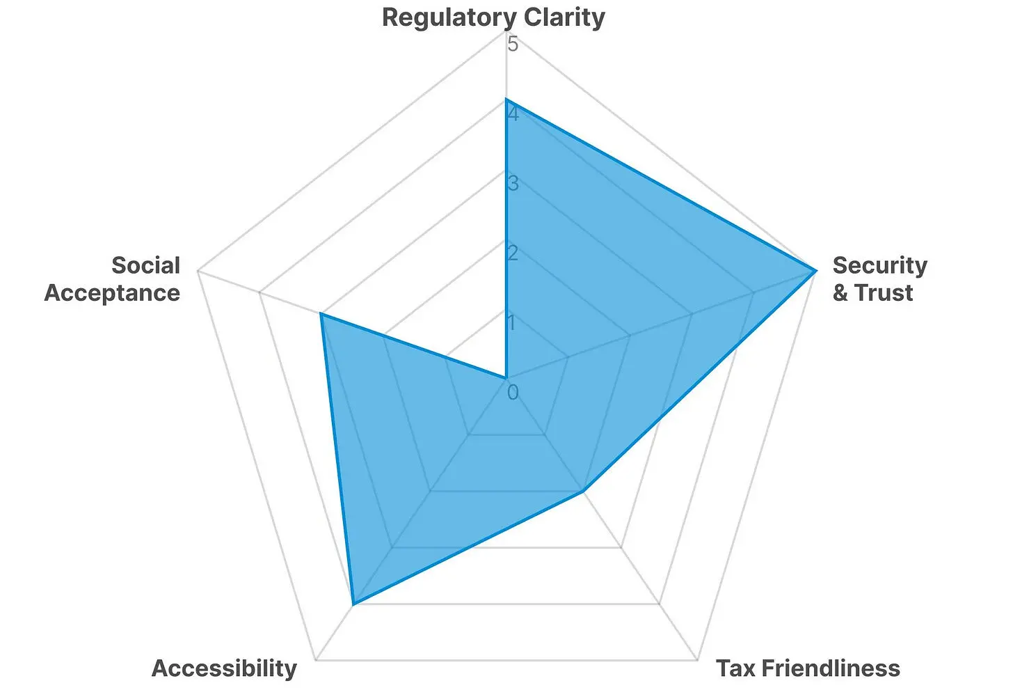 在报告涵盖的八个市场中,新加坡在所有五个障碍维度(监管、安全、税收、便利性和社会认知)上都表现最为均衡,没有哪个维度明显薄弱。