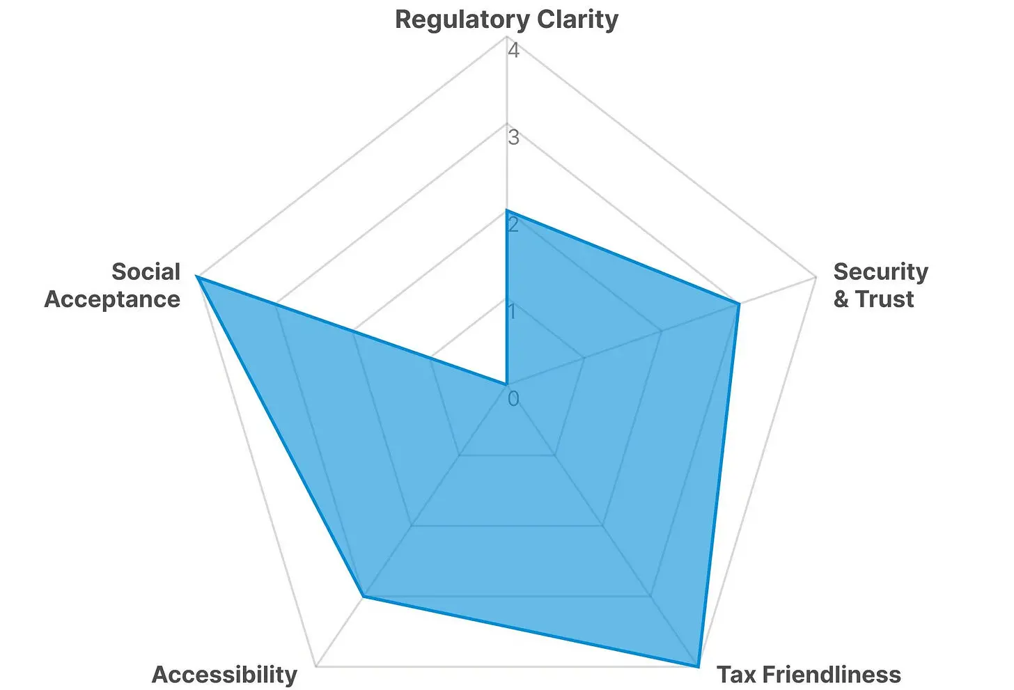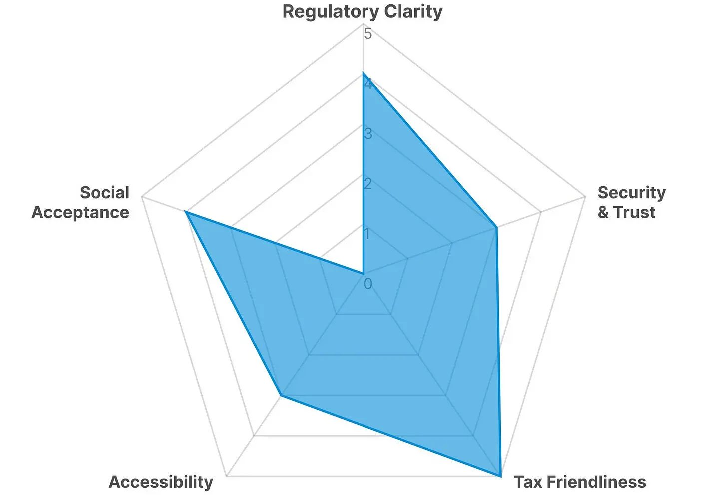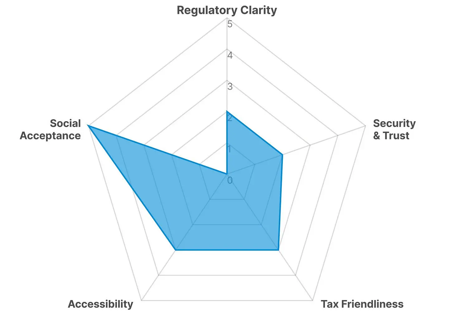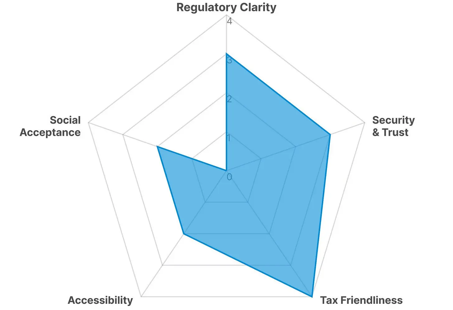 在报告涵盖的八个市场中,新加坡在所有五个障碍维度(监管、安全、税收、便利性和社会认知)上都表现最为均衡,没有哪个维度明显薄弱。