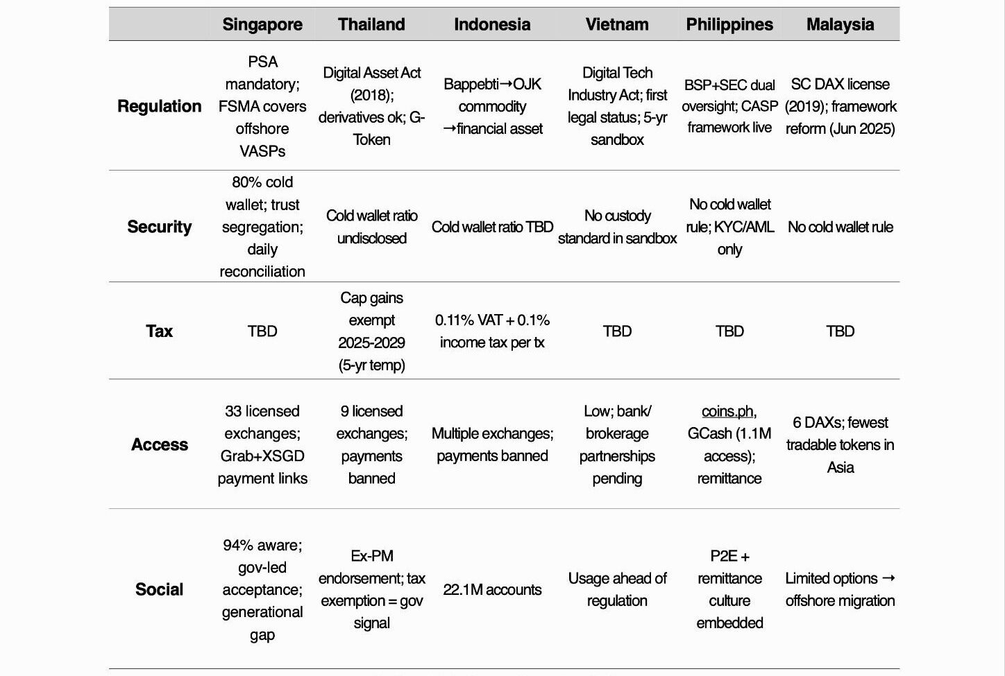 社会认可度已经足够,问题在于建立在其上的制度保护。菲律宾中央银行(BSP)自2022年9月起冻结了新的虚拟资产服务提供商(VASP)牌照发放。尽管冻结期延长至2025年9月,但目前仅有9家VASP存在。菲律宾证券交易委员会(SEC)于2025年7月实施了资本充足率监管框架(CASP),引入了最低资本、资产隔离和市场营销方面的规定,但该框架仍处于早期阶段。
