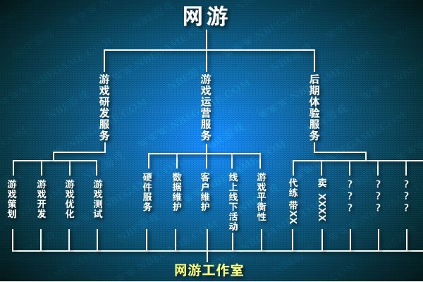 所有产业都一样,分为:售前,售中,和售后。网游服务虽然是多种多样的,也可以大致分为三大类:游戏研发服务,游戏运营服务,和后期体验服务。现在存在的工作室,相信95%的都是在做后期体验服务,而且是在做后期体验中一个很窄的服务范围,这也正是为什么游戏工作室到现在还没被社会完全认可,为什么老有人叫你Chinese farmer的原因之一。