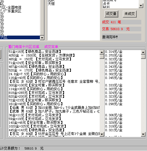 游戏属于老项目了,大概有4年左右了,交易量一直都还可以。只要你有金币就保下能卖出去的那种。但是封号还是比较厉害的。如果你有自己的独特防封方法还是一个长期稳定的项目的。由于封号原因本人只测试了1-30级刷主线出金,然后直接倒给仓库号卖掉。利润完全能够满足单机利润要求。