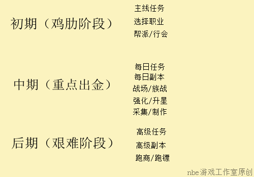 nbe首先把整个网游定义为三个阶段:为分初期,中期,后期
