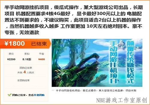 其三,已经有人开始转型了,通过上图的团购,朋友们已经看出点什么了,还有奔驰哥网赚秘籍给我们的启示。都说明了,单机1-2千的项目还是炙手可热的,无论是自动,还是手动。只是合适的项目,你要卖给合适的人。单机1千块的手动项目,也许对工作室来说,简直是看都没人看一眼,但换个想法,如果你卖给那些上班族,兼职玩家,或是普通游戏迷。如果玩着游戏还能每月赚个千来块钱,那这个价值简直是太大了。通过上图,就可以观察出,完全可行。