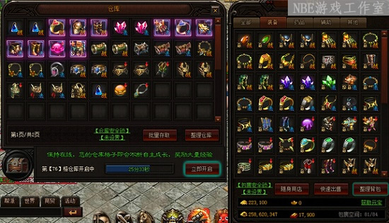 这是我刚才手动刷完今天的副本后的结果,大家可以和前面那张图对比下,仓库里最后三个装备就是今天合成出来的50级装备,正好3件,背包里30 40的装备也比之前多了些。刚才手动实际使用时间是不到15分钟,比前面按30分钟一批算的效率整整提高了一倍,当然手动肯定比脚本要效率,但是20分钟肯定也足够了。你的机器给力,脚本给力,自动交易仓库号,单机多做几个区,一天下来还是很不错的。