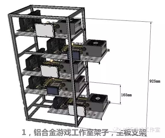 游戏工作室电脑主机多,一多起来就不能用机箱了,用机箱一个太占地方,另一个就是成本太高,还有就是,机箱是小环境,开始还行,一旦运行时间过长,灰尘一多,就会受潮、氧化、主板接口上就会有很多小黑点,所以游戏工作室机房一定要用架子!(硬件裸奔,这是现今游戏工作室的主流建设机房的方法)