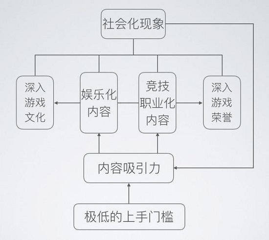 通过娱乐和竞技两手抓的方式,腾讯在 LOL 的推广上达到了空前的高度,通过丰富的生态娱乐内容吸引新玩家,通过专业化的电子竞技吸引高端玩家并维持其竞技环境的良好发展趋势,同时其中的一部分玩家会在深入游戏后又成为内容的产生者再回馈到内容中。