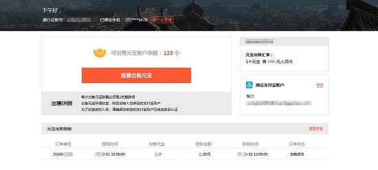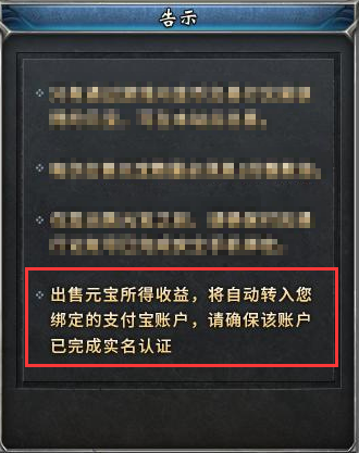 3,元宝出售所得收益,自动转入您绑定的支付宝账户(请确保账户已完成实名认证)