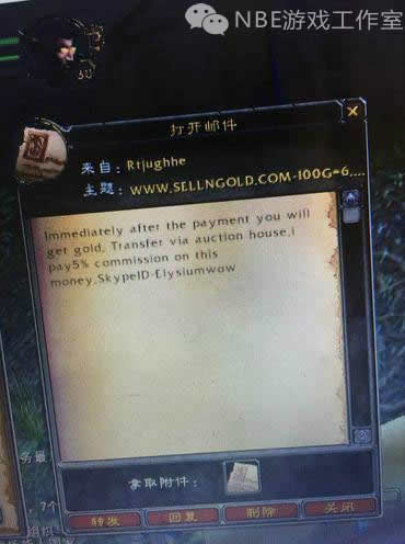 在Nostalrius服务器的中国玩家聚集地Nostalrius吧中,就有网友发布了一张广告邮件的图片。在信件中,发件人用不太熟练的英文写到:“付款之后,即可得金币”。而在帖子的回复中,网友从“购金网站”的ip地址中确定了他们来自国内。