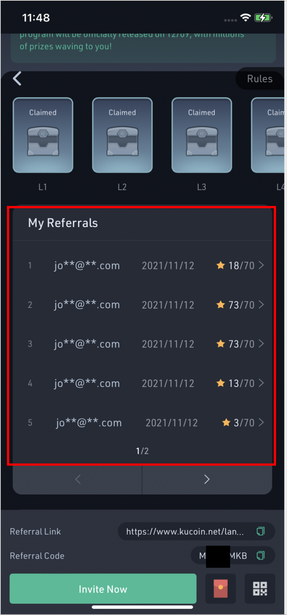 KuCoin邀請有禮簡單易用,用戶只需邀請好友賺取星星開啟寶箱,即可獲得驚喜好禮。 KuCoin邀請有禮已於2021年11月25日開啟公測,並於2022年5月24日上線2.0,10種寶箱已準備就緒,敬候您來開啟。