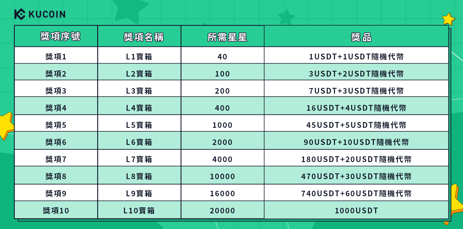 寶箱共10級,每級寶箱僅可開啟一次。用戶可自由選擇兌換寶箱順序,寶箱等級越高,獎品越豐厚,最高級別的寶箱獎品為1000USDT。