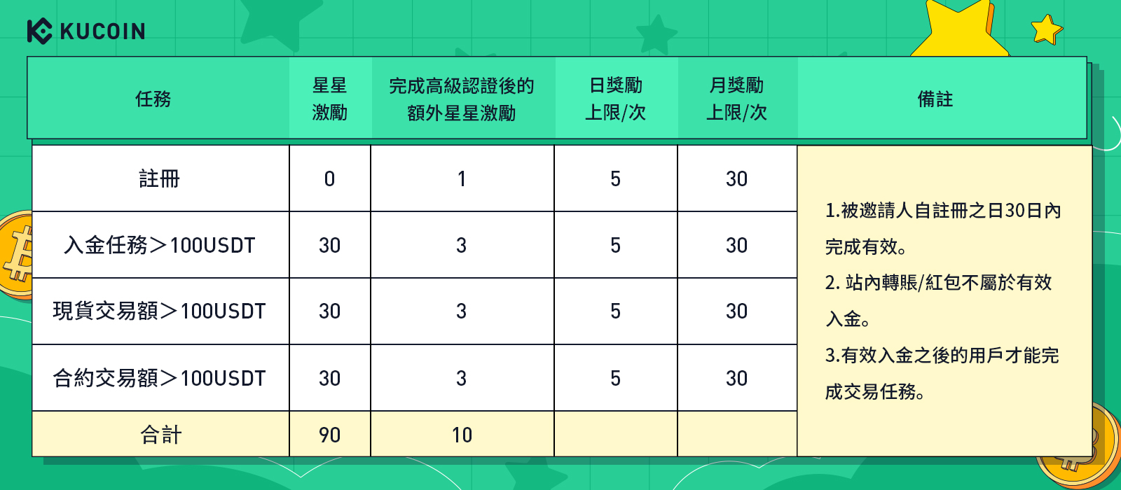 Bob成功邀請一個好友註冊,該好友在註冊之日起30日內未完成高級認證,但是完成入金>100USDT,現貨交易額>100USDT, 合約交易額>100USDT,則Bob可獲得90顆星星。