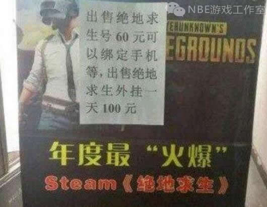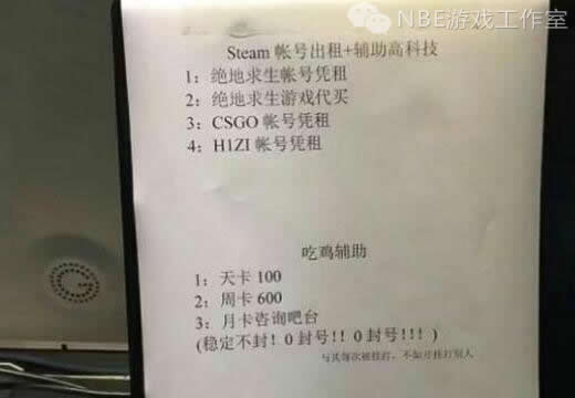 《绝地求生:大逃杀》的大火爆,又一次带动了Wg产业的繁荣!(虽然官方公布近几日又封了数万帐号,但,这都没用!中国玩家不差钱!)已经好久了,没看到写Wg,卖辅助能赚这么钱了!吃鸡辅助有多赚钱呢?近日网上得到一则消息,一网吧公然出售绝地求生Wg,100元一天,帐号60元一个!