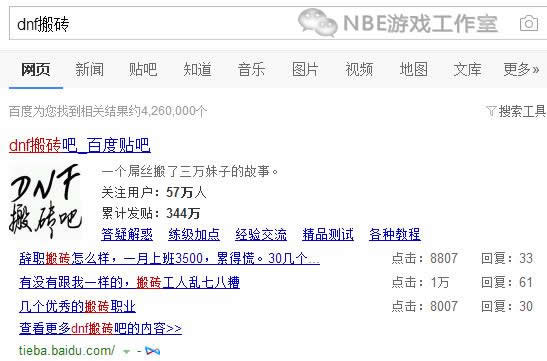 百度一下“dnf搬砖吧”有57万粉丝,还有这么一句话“一个屌丝搬了三万妹子的故事。”去那里的人,确实都是屌丝,能一个月都不出门的真正屌似。但是,这些人聚集在那里,不止只是为了妹子,为了一点零花钱,更不是为了游戏里能有一身可以炫富的装备,而是每个人都有一个逆袭土豪梦,搬砖-游戏工作室-日赚上千-买房买车。。。。