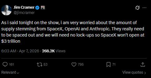 吉姆·克雷默於 2026 年 4 月 7 日發出警告。他表示非常擔心供應量的問題。該供應來自 SpaceX、OpenAI 和 Anthropic。克雷默呼籲將交易錯開進行。