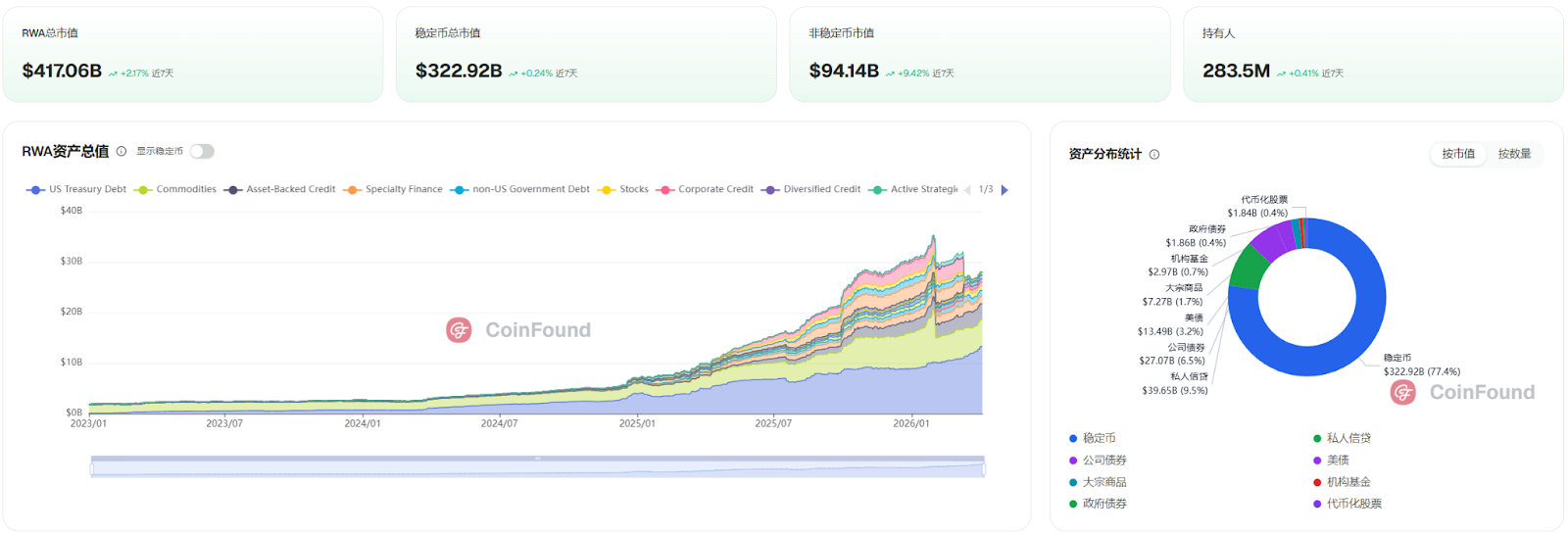 RWA 市場整體呈現穩健增長和機構持續加碼的態勢,顯示出較強的抗週期性。 (來源:CoinFound)