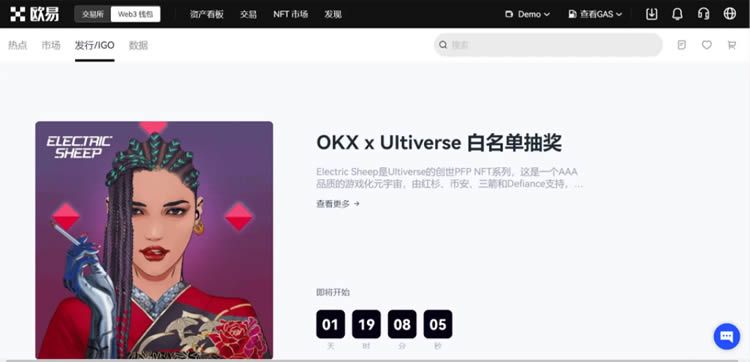 「发行/IGO」是欧易NFT联合艺术家、创作者、名人明星等推出的优质NFT资产的首发平台。通过该平台,您可以在NFT流入二级交易市场之前先行买入,从而获得更好的进入价格或是更早体验项目的优先权利,获得低价且高增长潜力的艺术品。