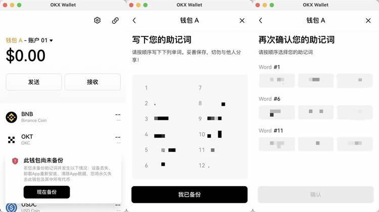 同时按照提示进行助记词备份,点击【现在备份】、【我已备份】,并对助记词进行验证。
