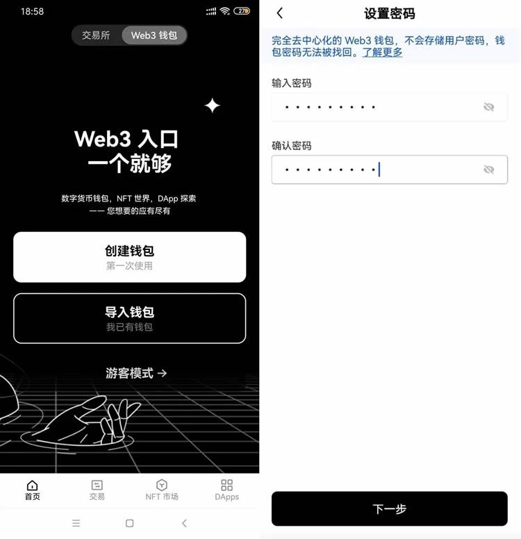 登录欧易APP,选择首页顶部的【Web3钱包】,点击【创建钱包】、在弹出的【设置密码】中,输入密码并进行确认,可以创建成功。