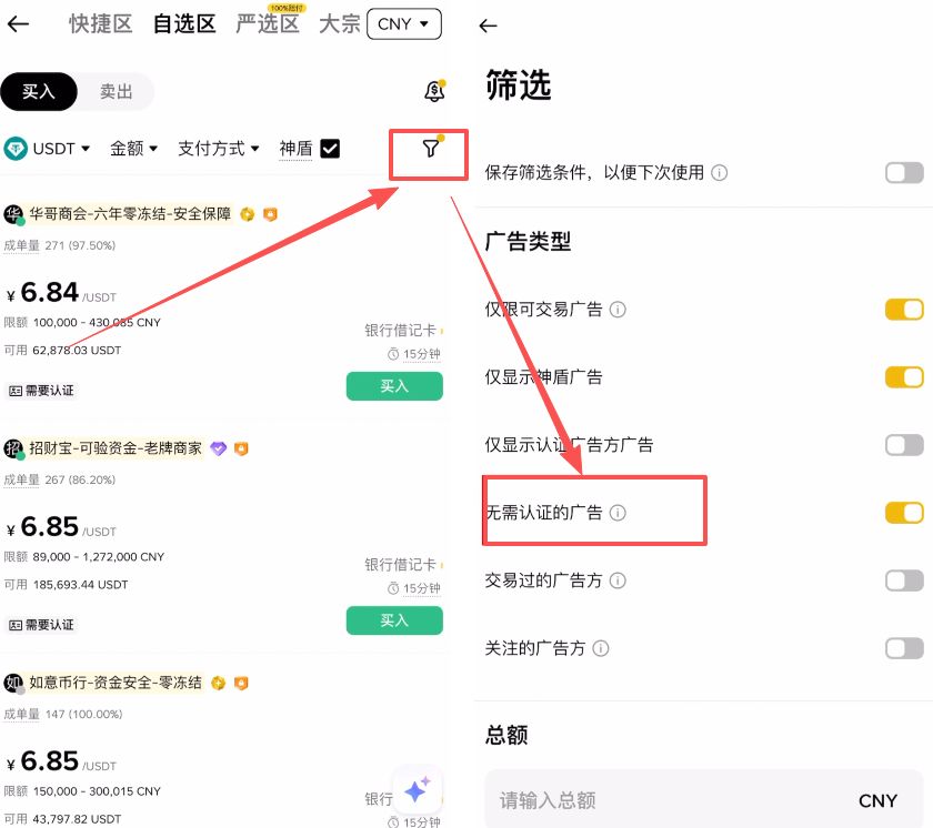 2、过滤广告:点击右上角的小漏斗,开启「无需认证的广告」,这样可以省去繁琐的自证流程。