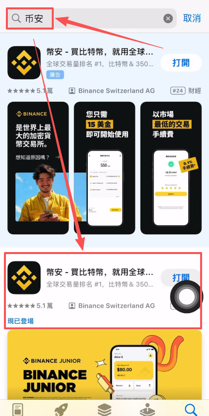 购买完成之后,去appstore里面换登,然后你搜索“币安”,就可以来下载币安了。