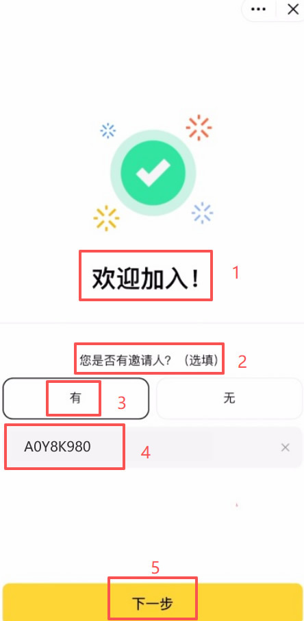 它会告诉我们“欢迎加入”,问我们是否有邀请人?我们一定要点击“有”,然后输入邀请ID XC246CTG,点击【下一步】。